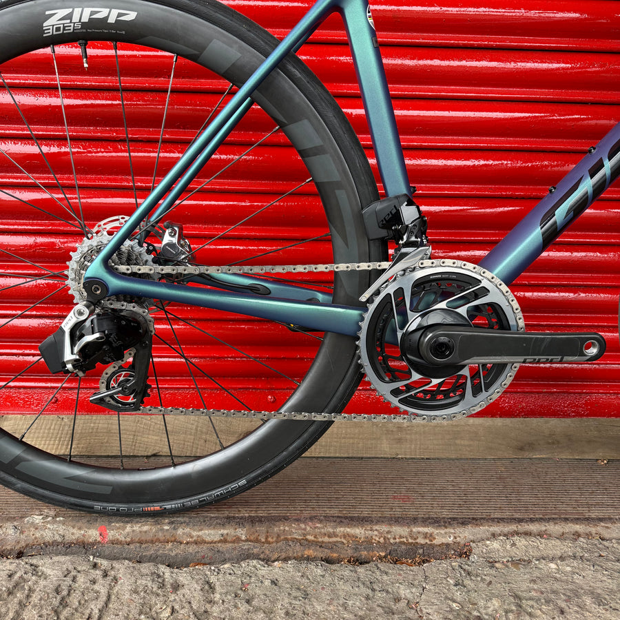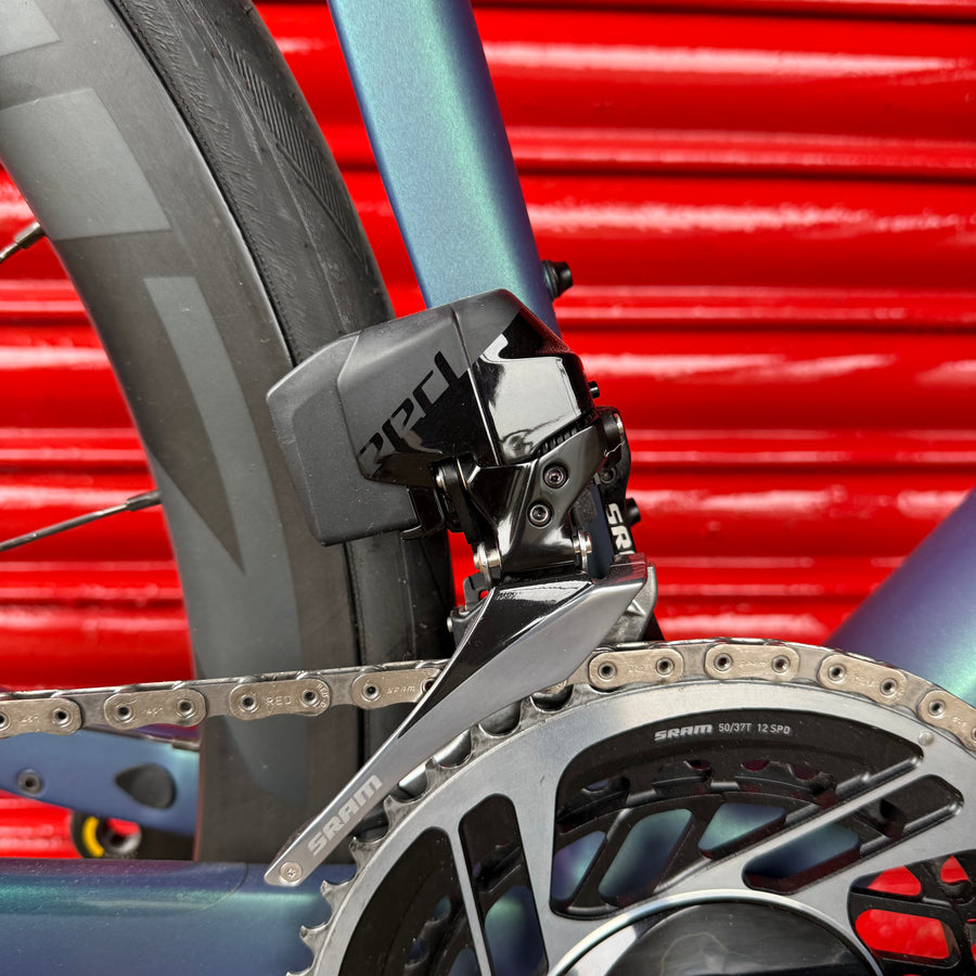 The SRAM RED eTap AXS drivetrain includes an integrated Quarq DZero power meter to provide precise training and racing power data. The wireless electronic shifting system features new derailleur technologies and simple, intuitive shifter/brake levers.