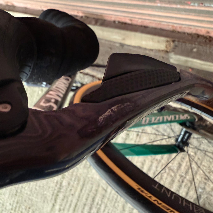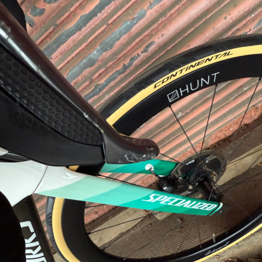 The Venge also houses some exciting new features. The new cockpit, developed in partnership with Specialized's World Tour teams, features a stem with a higher stiffness, new bars that are faster, lighter, stiffer, and feature a textured pattern on the tops for extra grip and control. Next up is tyre clearance - it has no problem clearing 32mm-wide tyres. Finally, a Shimano A-Junction has been put in the seatpost, making it easy to charge, check battery levels, and for team mechanics to make adjustments.