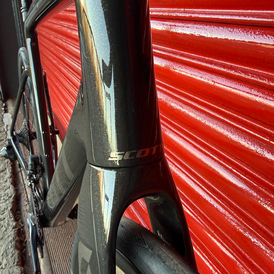One of the most notable thing about the Addict is its clean lines, thanks to a complete lack of any external cables, hoses or wires. The frame, fork and components have been designed to work as an integrated solution, between them running all of the hoses, wires and cables internally from the levers until they exit next to the components they are connected to. It looks cool, and you get a small amount of an aero boost no doubt. The quality of the frame and fork is high, and I think the blue paint job makes the Scott look more expensive than it actually is, though you aren't getting all of the neat touches found on the higher spec Addict RC models, which use the lighter HMX frame and fork.