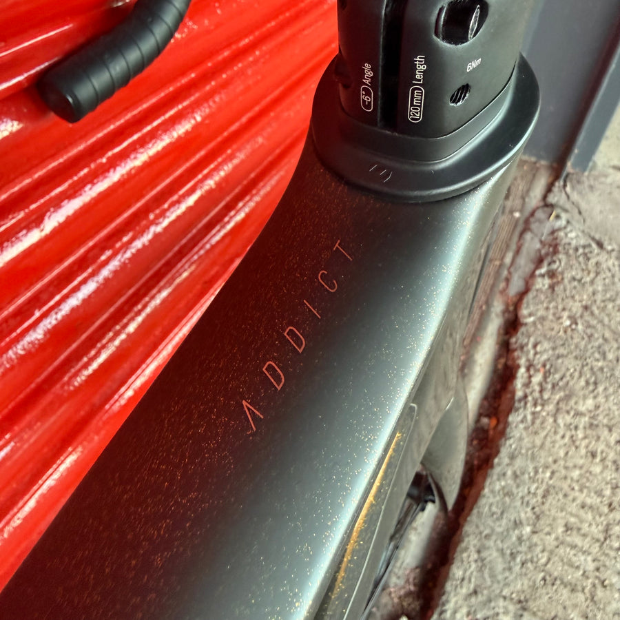 The steering is fast enough for high-speed descents, it enables you to push hard through the corners with precision, but thanks to the front end not being twitchy, or the steering really quick, it boosts confidence even if you're not the most fearless descended. The wheelbase, at just over a metre, gives the Addict a composed but still relatively nimble feeling, great for making good progress on unfamiliar roads or on far from perfect surfaces.