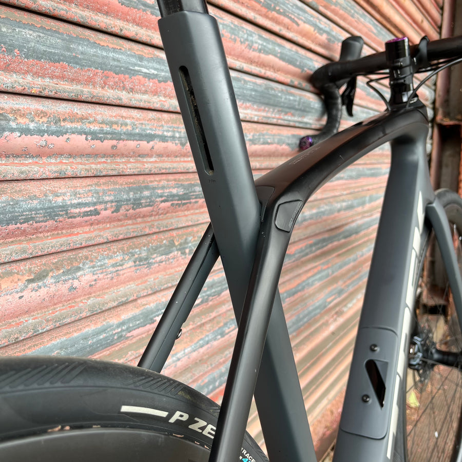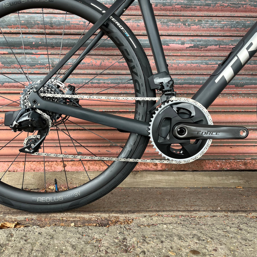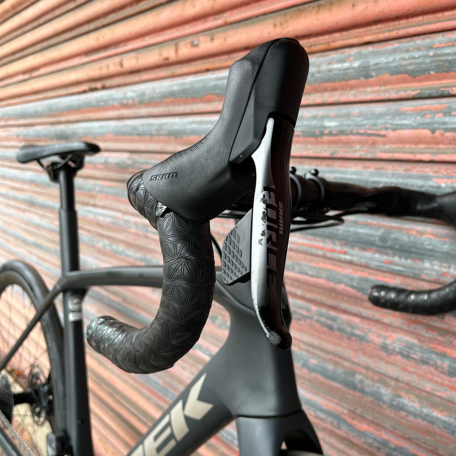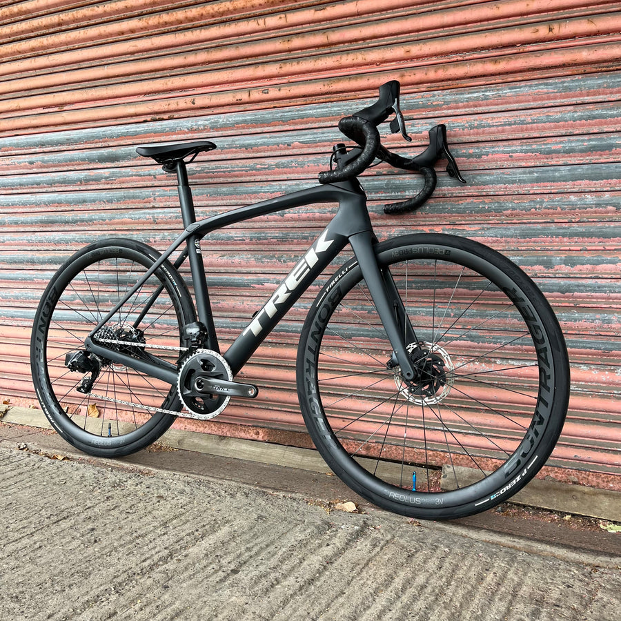 A 500 Series OCLV Carbon frame and fork with a stable Endurance Geometry, integrated internal storage and road-smoothing Front and Rear IsoSpeed. A full SRAM Force eTap AXS 2x12 wireless electronic drivetrain, and powerful disc brakes. Plus, tubeless-ready Bontrager Aeolus Pro 3V carbon wheels and a fatigue-reducing IsoZone handlebar.