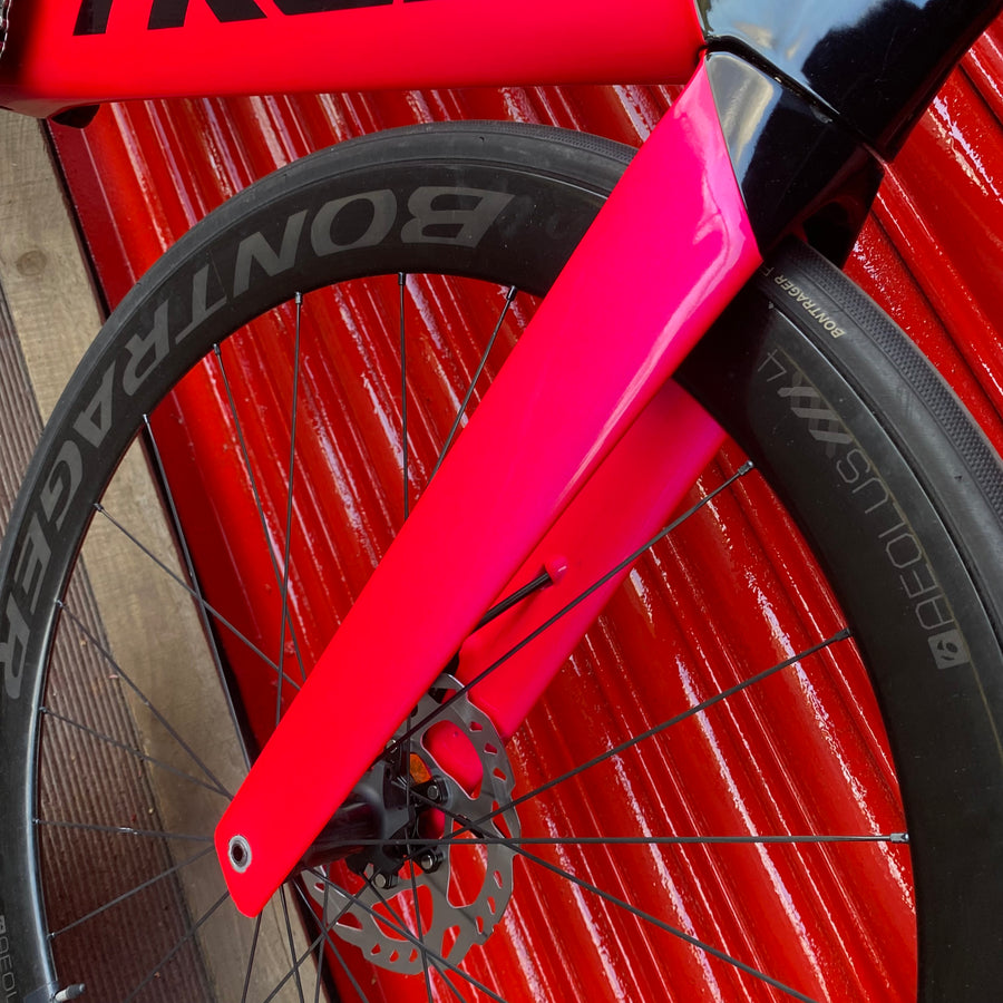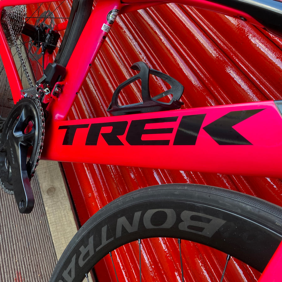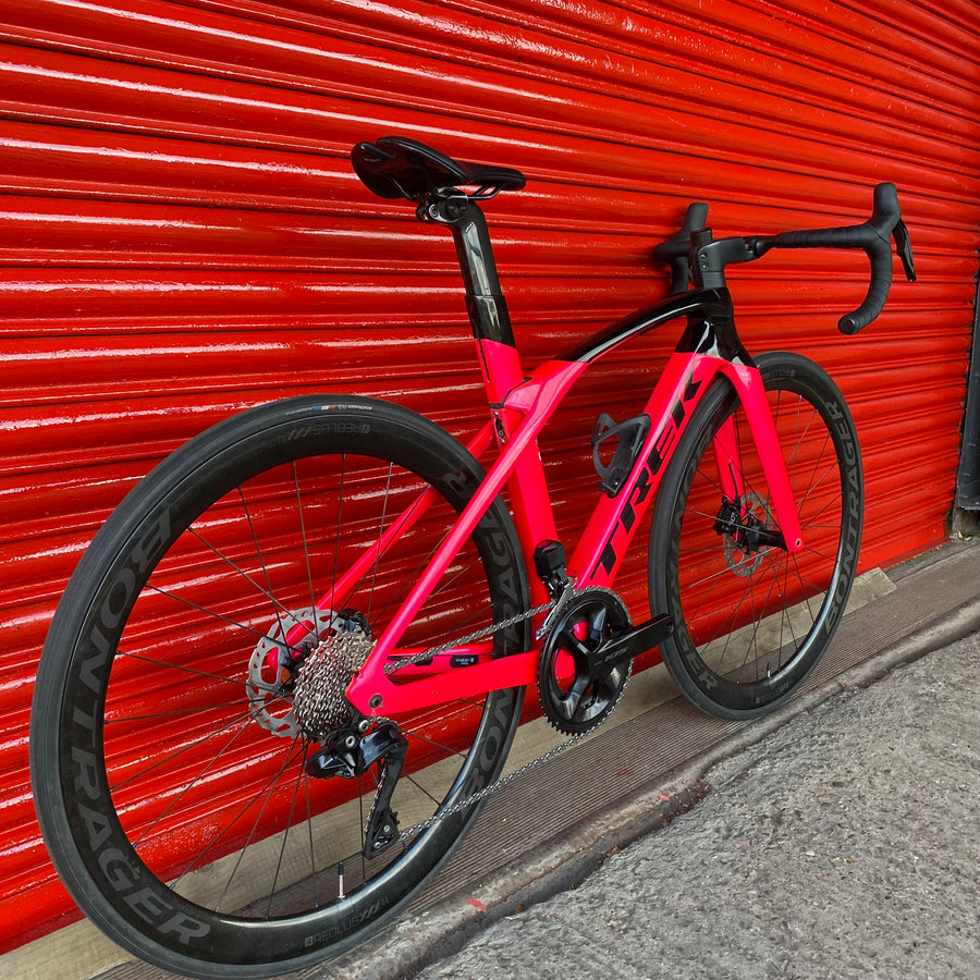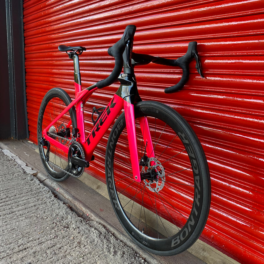 A lightweight 700 Series OCLV Carbon frame with Kammtail Virtual Foil aerodynamic tube shaping and road-smoothing Adjustable Top Tube IsoSpeed, KVF full carbon disc fork, an adjustable aero bar and stem, a 2x12 Shimano 105 Di2 electronic drivetrain, Tubeless Ready Bontrager Aeolus XXX Disc wheels, a micro-adjust Madone seatmast and Shimano flat-mount hydraulic disc brakes.